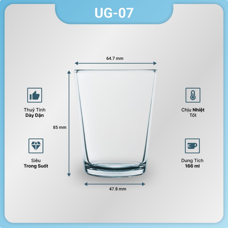 - Không sử dụng ly thủy tinh UG cho các chất lỏng nóng trên 60 độ C hoặc cho thực phẩm có tính acid mạnh, có thể làm hỏng bề mặt thủy tinh.