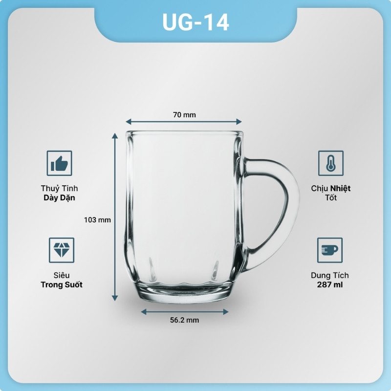 Bộ 6 cốc thủy tinh UG 114 có quai cầm in logo dung tích 287ml sang trọng và tiện ích, đặc biệt được thiết kế với quai cầm và in logo theo yêu cầu, tạo điểm nhấn cho thương hiệu.