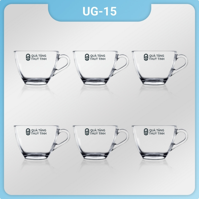 Bộ 6 cốc thủy tinh UG 115 in logo dáng lùn có quai dung tích 220ml là sản phẩm của thương hiệu Union Glass, được sản xuất tại Thái Lan. Bộ cốc này có thiết kế dáng lùn, thân tròn, quai cầm chắc chắn, có thể dùng để uống nước, trà, cà phê,…
