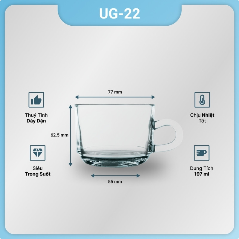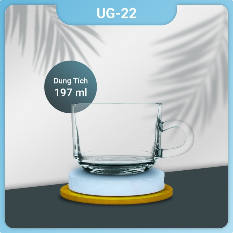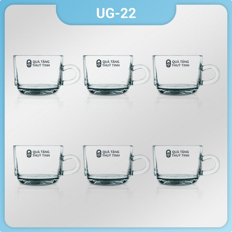 Bộ 6 cốc thủy tinh UG 122 in logo dáng thấp có quai dung tích 197ml là sản phẩm chất lượng cao với thiết kế độc đáo, tiện ích cao, được chế tạo để đáp ứng nhu cầu thưởng thức trà và cà phê của người sử dụng. Với kiểu dáng thấp và quai cầm tiện lợi, mang lại trải nghiệm sử dụng thoải mái và thú vị.