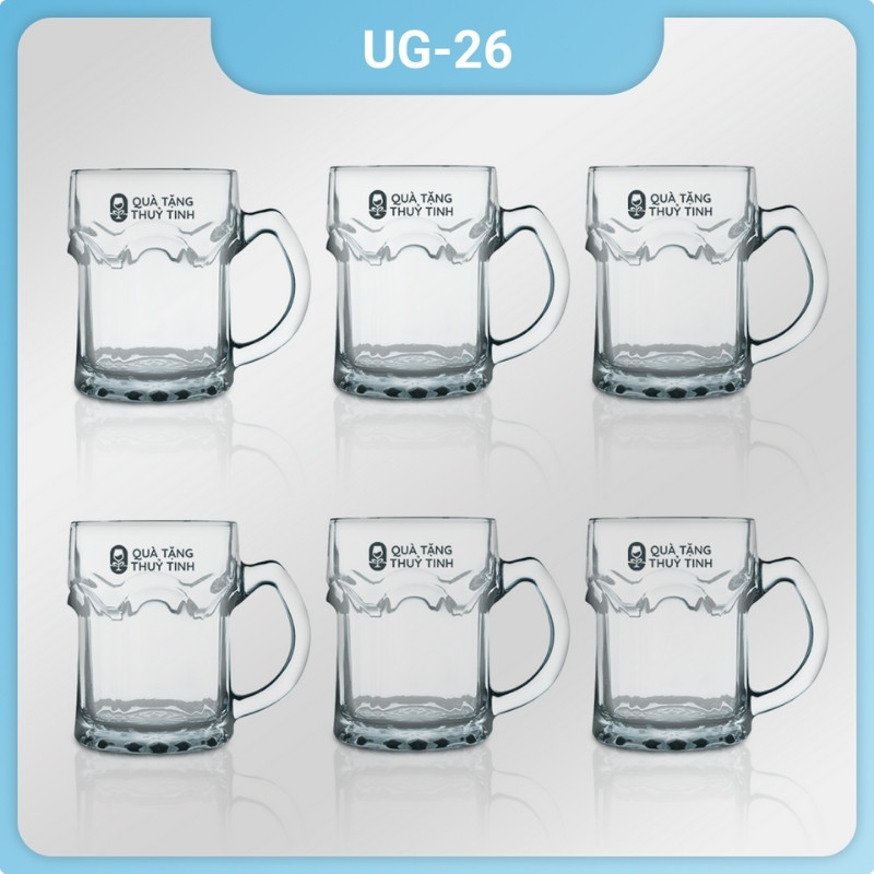 Bộ 6 cốc thủy tinh UG 126 in logo có quai cầm dung tích 355ml là sản phẩm hoàn hảo cho những người yêu thích thưởng thức bia và đồ uống một cách tinh tế và tiện lợi.
