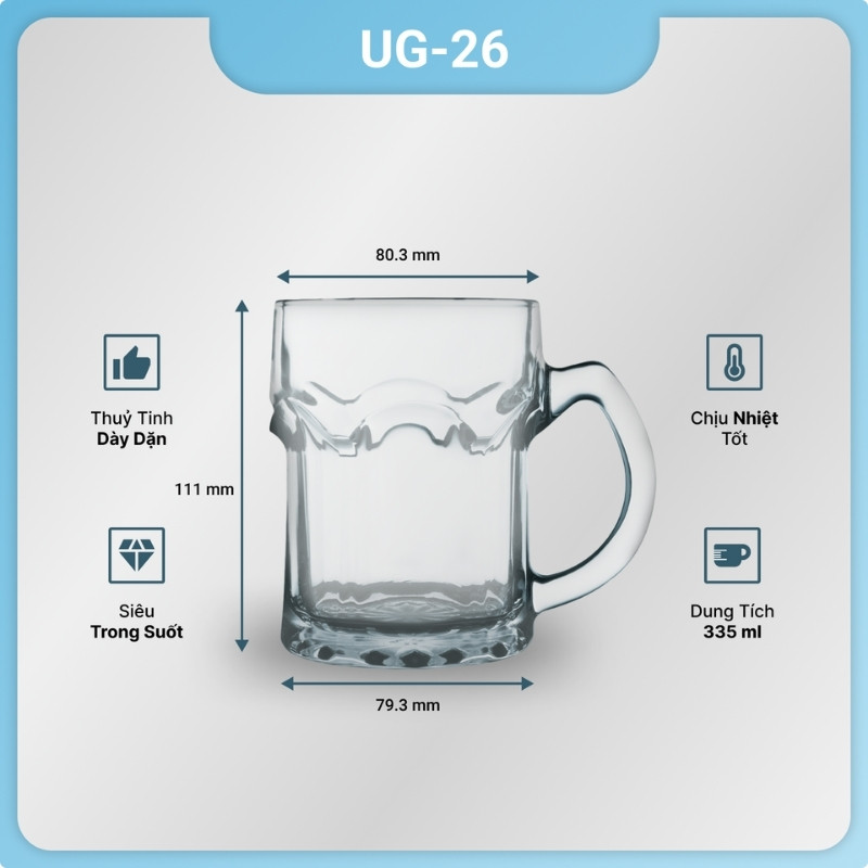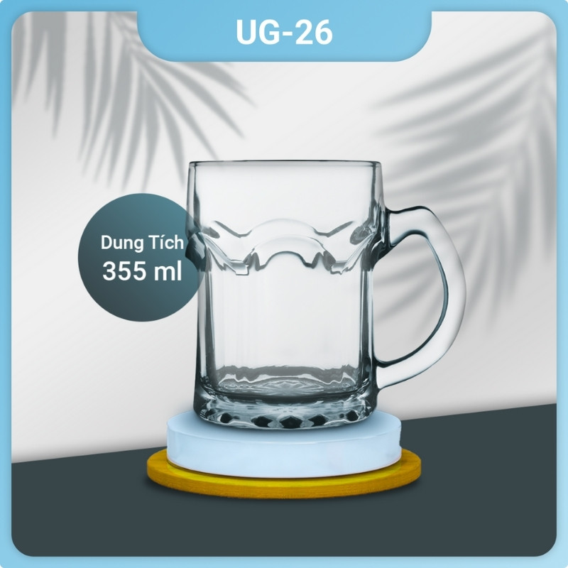 Cốc bia thủy tinh UG 126 có kiểu dáng trụ tròn với thân dày, miệng rộng và quai cầm chắc chắn. Quai cầm được thiết kế chắc chắn, tăng thêm sự thoải mái khi cầm nắm.