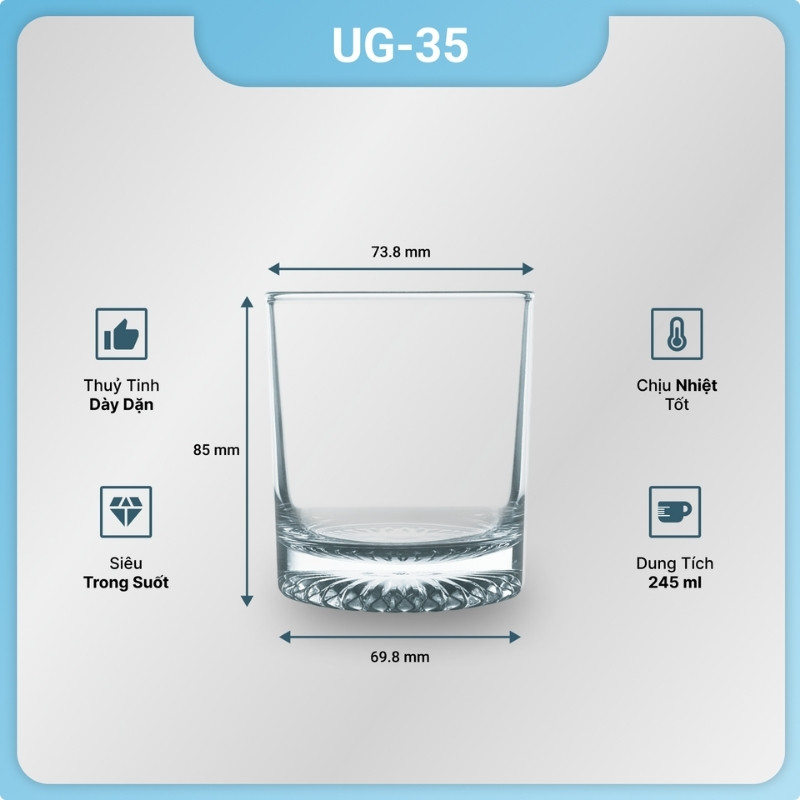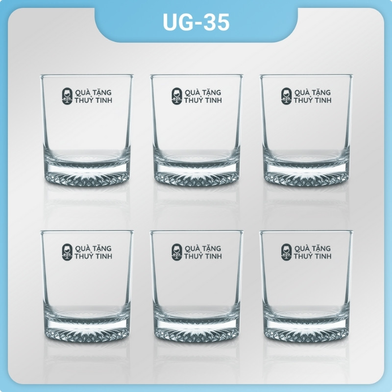 Bộ 6 cốc thủy tinh UG 135 dáng lùn tròn in logo dung tích 245ml sang trọng và đẳng cấp với thiết kế đặc trưng của kiểu dáng lùn tròn, miệng rộng và họa tiết đáy kim cương.