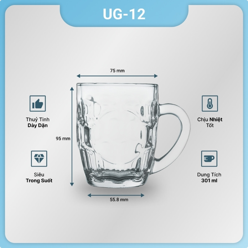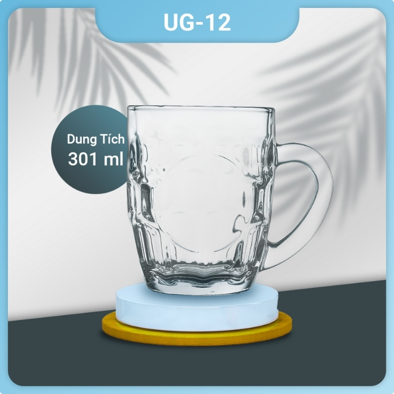 Bộ ly thủy tinh UG 112 in logo có quai dung tích 301ml được làm từ chất liệu thủy tinh cao cấp, có độ trong suốt cao, không chứa chì, an toàn cho sức khỏe người sử dụng.